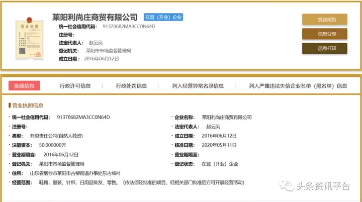 据了解,公司全名叫做莱阳利尚庄商贸有限公司,成立于2016年6月12日,注册资金50万元,实缴10万元,法人代表赵云凤。