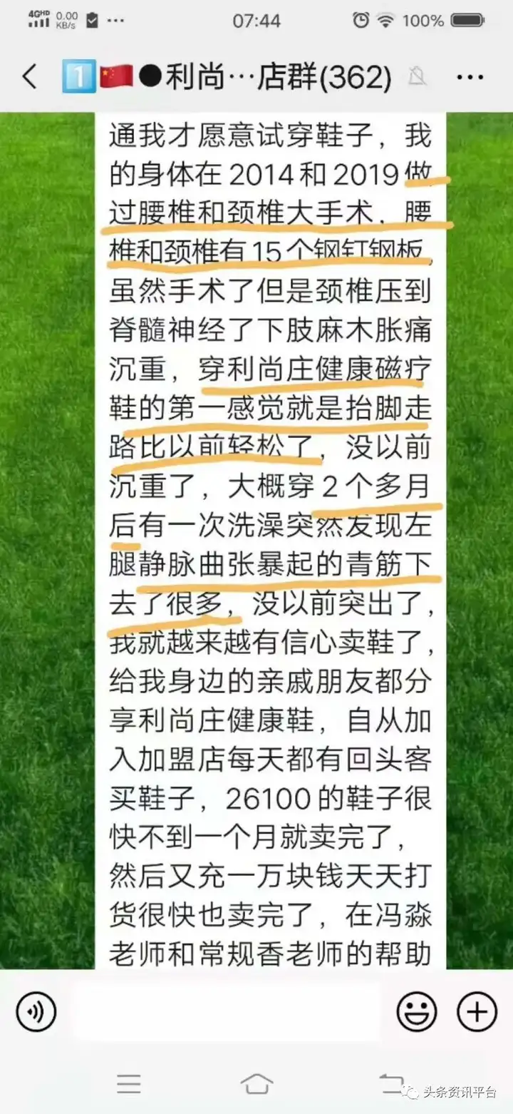 除此之外,利尚庄还有许多经销商的病例分享:做过腰椎和颈椎大手术后,腰椎和颈椎有15个钢钉钢板,由于颈椎压迫脊髓神经导致下肢麻木胀痛有沉重感,穿上利尚庄健康磁疗鞋的第一感觉就是抬脚走路比以前轻松多了,穿了两个多月后发现左腿静脉曲张暴起的青筋下去了很多,于是对卖鞋更有信心,分享给身边的亲戚朋友,很快就卖完。