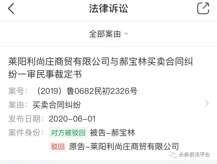 另外,就在今年6月,莱阳利尚庄商贸有限公司作为原告卷入了买卖合同纠纷,但最后以被告不明确为由被法院裁定驳回起诉。