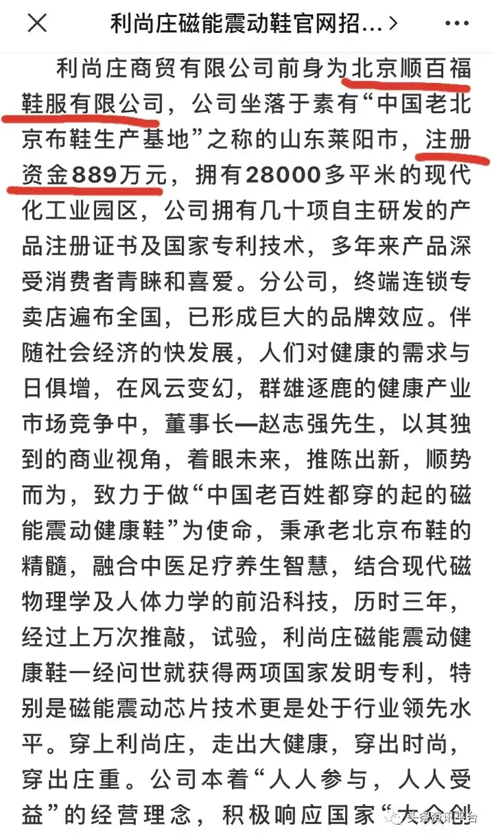 值得一提的是,在名为“利尚庄磁能震动鞋官网招商加盟部”的公众号文章里提到,公司的前身为北京顺百福鞋服有限公司,注册资金889万元,而经过查询我们却并没有发现这家北京顺百福鞋服有限公司的身影。