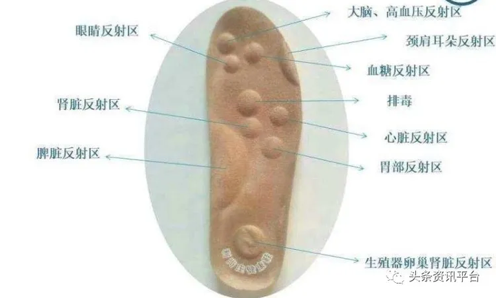 而鞋底的按摩鞋垫,凸起点分别对应足底的重要穴位点,包括大脑、眼睛、心脏、肾脏、胃部、生殖器官等多个身体反射区,走路时对这些穴位进行软按摩,从而达到足疗的效果。