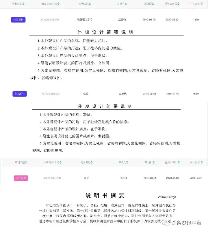 种种宣传似乎都没有什么毛病,甚至宣传资料中还表明前文提到的磁能振动芯片、按摩鞋垫还有国家专利,对此,我们到国家知识产权局对三个专利号2019302895429、2019302895503、2019208484260进行查询,了解到鞋垫和鞋垫磁力芯片仅属于外观设计专利,并没有什么神奇之处,而整个鞋子属于实用新型专利,对于该专利的说明也只是解决了现有技术中鞋子抗冲击力较弱的技术问题。
