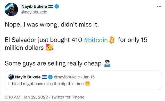 据了解,此前布克利在上周五(1月21日)发推称,萨尔瓦多在比特币大跌之际又花费1500万美元买入了410枚,并感叹“有些人真是卖得太便宜了”。