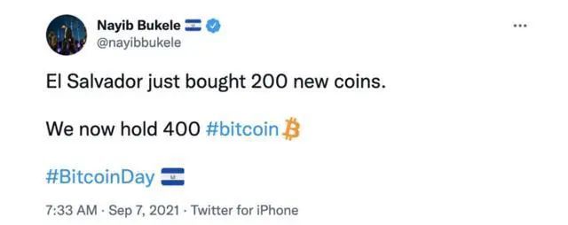 萨尔瓦多总统纳伊布·布克利当日也在社交媒体宣布,该国政府已经购买了400枚比特币。以该推文发布时的比特币价格计算,萨尔多瓦购买的虚拟货币总额约为2090万美元。