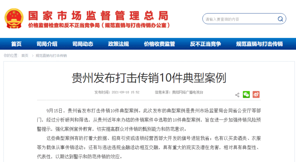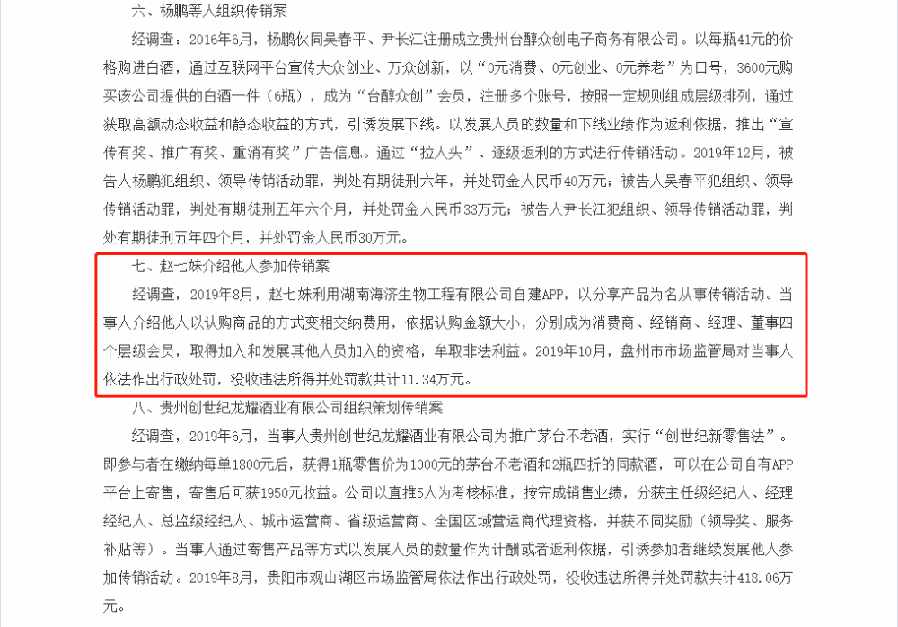 而在在今年9月15日,贵州省打击传销工作情况新闻通气会上发布了打击传销10件典型案例。其中,海济生物被提及。据第七条赵七妹介绍他人参加传销案介绍,赵七妹利用湖南海济生物工程有限公司自建APP,以分享产品为名从事传销活动。当事人介绍他人以认购商品的方式变相交纳费用,依据认购金额大小,分别成为消费商、经销商、经理、董事四个层级会员,取得加入和发展其他人员加入的资格,牟取非法利益。2019年10月,盘州市市场监管局对当事人依法作出行政处罚,没收违法所得并处罚款共计11.34万元。据悉,该十大案例文章已被市场监督管理总局及其他权威媒体转载刊发。