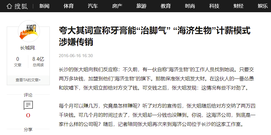 北青健康注意到,海济生物此前曾被湖南电视台经视频道《钟山说事》栏目曝光,质疑海济生物不仅夸大宣传称牙膏可治疗脚气,其计酬模式也存在涉嫌传销行为。节目发布后引来多家媒体关注,中国青年网、长城网等媒体对此进行了报道。