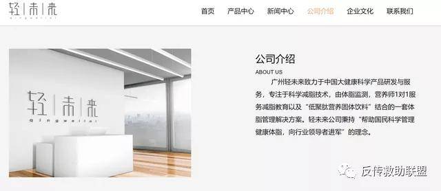 据该公司官网显示,广州轻未来致力于中国大健康科学产品研发与服务,专注于科学减脂技术,由体脂监测,营养师1对1服务减脂教育以及“低聚肽营养固体饮料”结合的一套体脂管理解决方案。轻未来公司秉持“帮助国民科学管理健康体脂,向行业领导者进军”的理念。