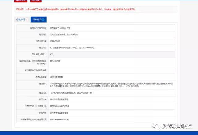 信用中国山东省发布一则行政处罚决定文书,据滨市监处字〔2022〕1号显示,广州轻未来生物科技有限公司通过微信等互联网社交平台销售产品,发展会员,被发展人员继续通过微信等形式为当事人发展会员,当事人通过会员系统确认团队及人员发展关系,团队计酬的行为,违反了《中华人民共和国禁止传销条例》第七条第(二三)项的规定。