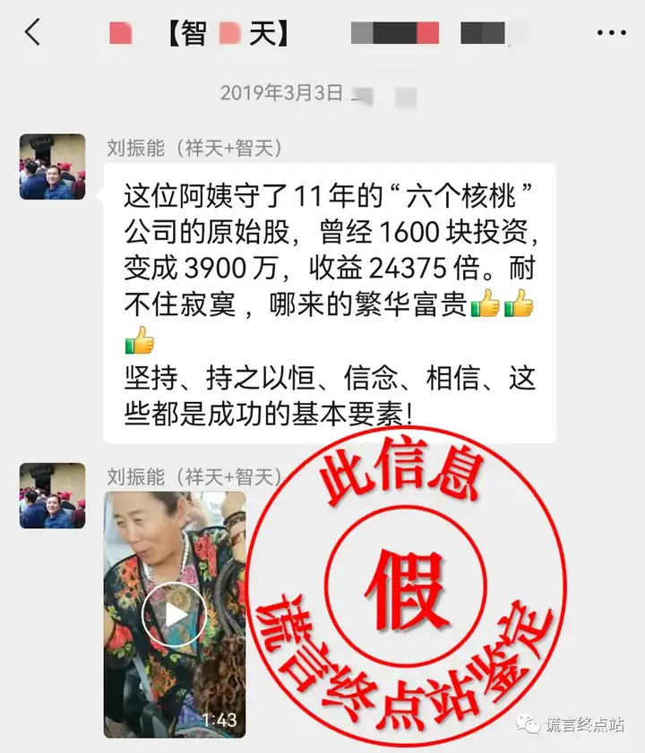 因此,这一彩衣大妈自称购买“六个核桃”原始股的“谎言”,不攻自破!