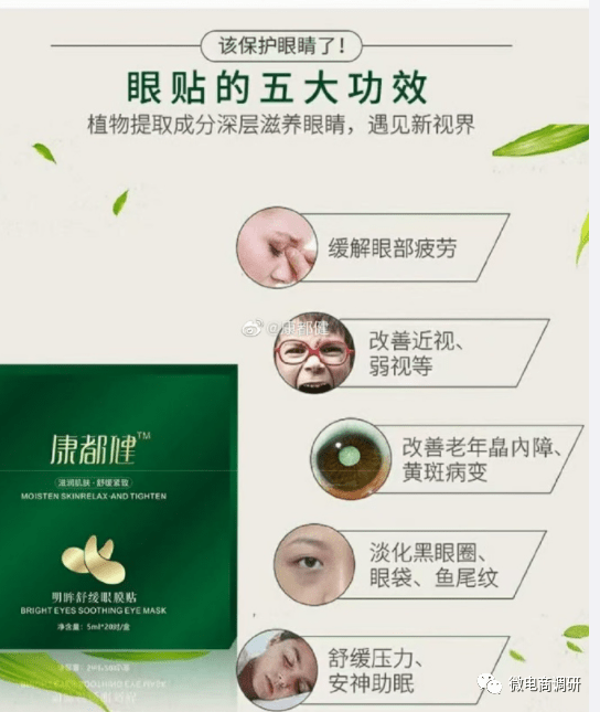 说到这款眼膜贴的功效,在如今的微博和小红书等平台上,有多位推广人员指出这款眼膜贴具有改善近视、促进细胞微循环、改善眼疲劳等多重作用,这种宣传的本源甚至还可追溯到康都健的官方商城。