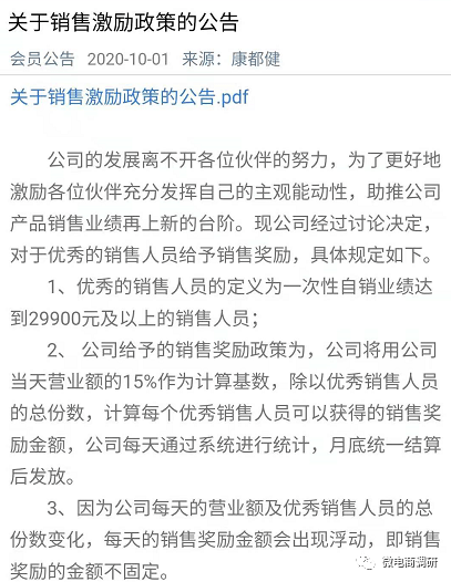 据了解,购买10单产品,可成为康都健的体验代理,门槛为2990元,复购奖是每单189元,销售奖为每单90元,体验代理推荐一个体验代理奖励900元;购买100单产品,可成为皇钻代理,门槛为29900元,复购奖是每单149元,销售奖为每单120元,推荐一个体验代理或者皇钻代理都奖励1200元,此时级差为300元,下面再复购,复购差为每单40元。
