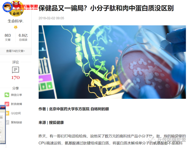 那么肽究竟是什么?小分子肽真的有这么多神奇的功效吗?反传防骗联盟在搜狐健康发布于2018年2月的《保健品又一骗局?小分子肽和肉中蛋白质没区别》一文中找到了答案: