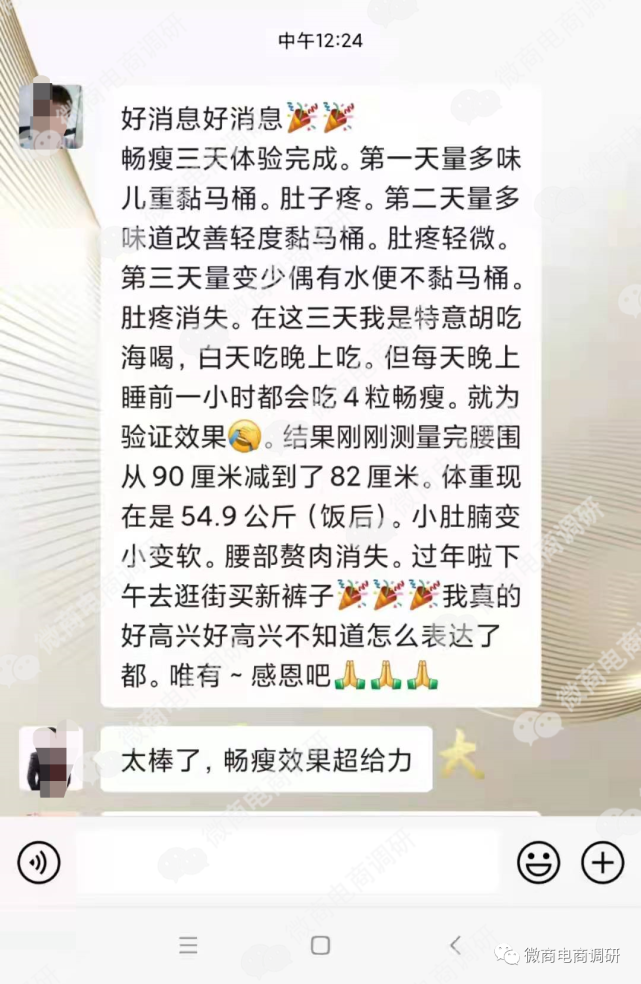 虽然这是一款普通食品,但是代理们却使劲在宣传具有排油减脂的功效。有人说自己体验了三天畅瘦产品,这三天每天都胡吃海喝,每天睡前吃4粒畅瘦,结果腰围从90厘米减到82厘米,体重减轻至54.9公斤,小肚腩变小变软,腰部赘肉消失。还有人说吃了畅瘦之后不一会就上了两次厕所,而且还改善了自己上厕所肚子疼的毛病。