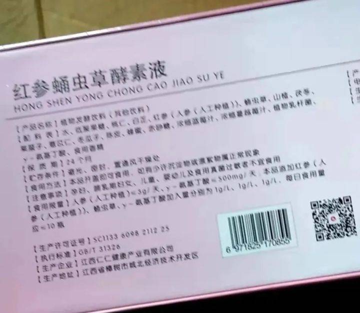 据了解,刘女士收到的是一款名为红参蛹虫草酵素液的植物发酵饮料,在产品外包装的显著位置有“仁和”字样和商标。