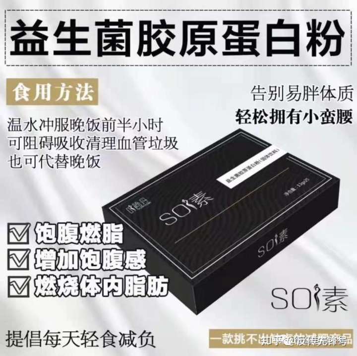 而对于益生菌胶原蛋白粉的描述,也与上述关于益生菌胶原蛋白果冻的说法相类似,其宣传资料显示如下:该产品也同样具有抑糖燃脂、排毒瘦身、提升免疫力、速清肠道等保健功能。