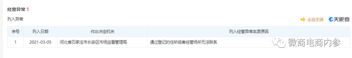在刚刚过去的2021年的3月5日,河北丹妮生物科技有限公司已因通过登记的住所或者经营场所无法联系,而被河北省石家庄市长安区市场监督管理局列入经营异常名录,至今未被移除。