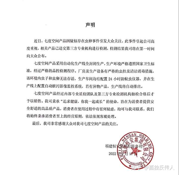 2月17日晚,七度空间官方账号发布声明,称相关产品已送交第三方专业机构进行检测,检测结果将第一时间向大众公布。