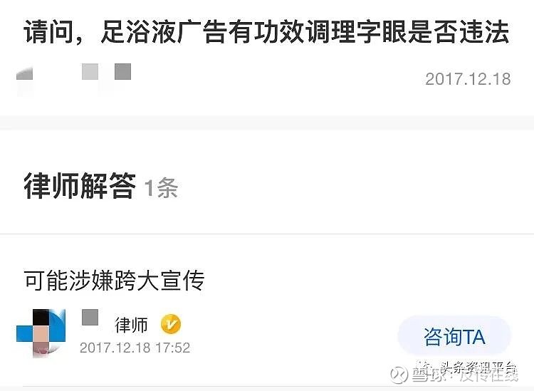 之前也有群众在网上咨询有关律师足浴液广告中有功效调理字眼是否违法,对此,律师给出的答复是可能涉嫌夸大宣传。