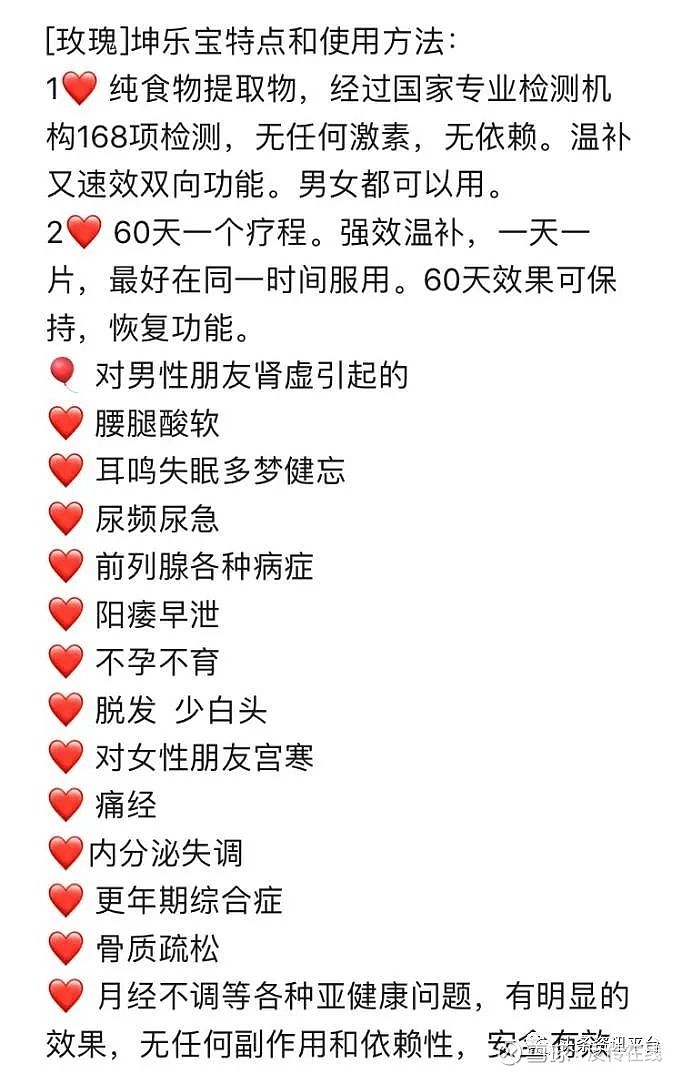 同样地,公司的另外一款叫做“坤乐宝”黄精枸杞压片糖果的产品,据说是纯食物提取物,男女都可以用,针对不孕不育、阳痿早泄、内分泌失调、月经不调等各种亚健康问题,有明显的效果,并且承诺无任何副作用和依赖性,安全有效。