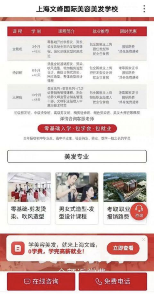 2022年3月7日,上海文峰职业技能培训学校(以下简称“文峰学校”)因宣传“高薪就业保障”“零基础入学,包学会,包就业”等内容,被罚款32.81万元,并成为了上海市市场监管局公布的2022年第二批虚假违法广告典型案例。