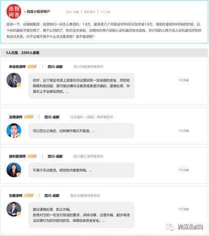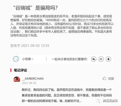 此外,有网友在小红书留言道,“谷瑞城”是一种蔬菜水果自助贩卖机柜平台,老是听我妈说起这个事,感觉很想骗局,好怕我妈也被骗。18000购买一台,盈利的百分之六十的点归机柜购买人,并保证每天有60块钱的收入,没有盈利60公司补贴,购买10多台机柜就可以入股,机柜放置高档小区(具体有没有实物不知道,是不是放了那么多台机柜也没法查),我们那边好多中老年人都投资了。越想越觉得像骗局。不知道大家有没有听说过这个东西。