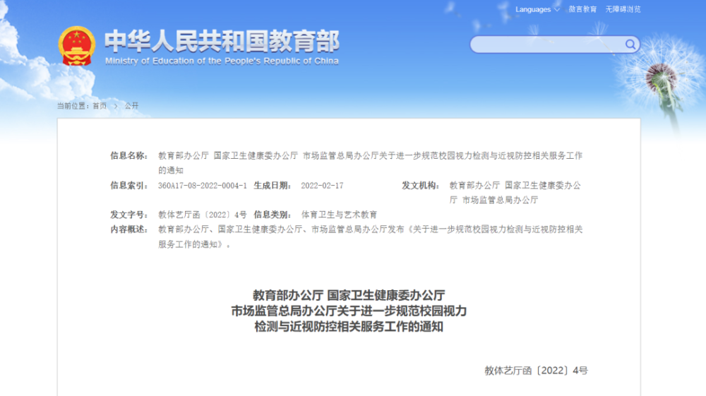 继2021年11月市场监管总局开展儿童青少年近视防控产品违法违规商业营销宣传专项整治行动后,2022年2月10日,教育部、国家卫生健康委、市场监管总局三部门再次联合印发《关于进一步规范校园视力检测与近视防控相关服务工作的通知》。