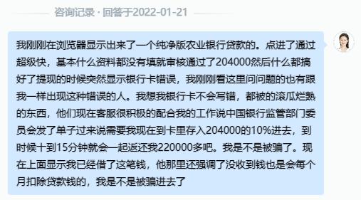 于是,苏某在这个所谓的“农行纯净版”APP上跟客服聊天,聊天过程中,他跟对方说需要申请5000元贷款。