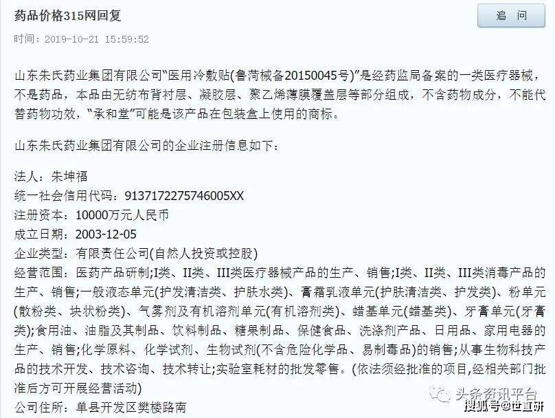 调查还发现,曾有网友在药品价格315网上咨询:“承和堂医用冷敷贴是真的吗?”对此,药品价格315网表示:“山东朱氏药业集团有限公司‘医用冷敷贴(鲁菏械备20150045号)’是经药监局备案的一类医疗器械,不是药品,本品由无纺布背衬层、凝胶层、聚乙烯薄膜覆盖层等部分组成,不含药物成分,不能代替药物功效,“承和堂”可能是该产品在包装盒上使用的商标。”