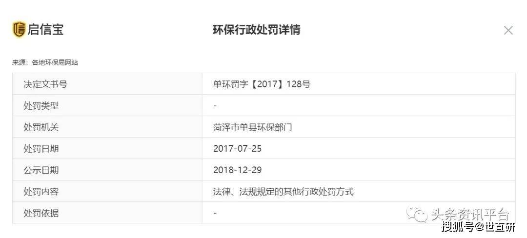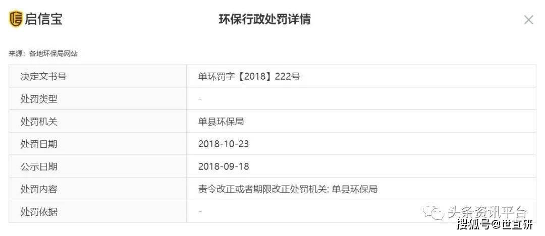 经查,2017年7月25日,该公司因“行政违法行为”被菏泽市单县环保部门处以行政处罚。2018年10月23日,该公司被单县环保局实行责令更改或期限改正的处罚。