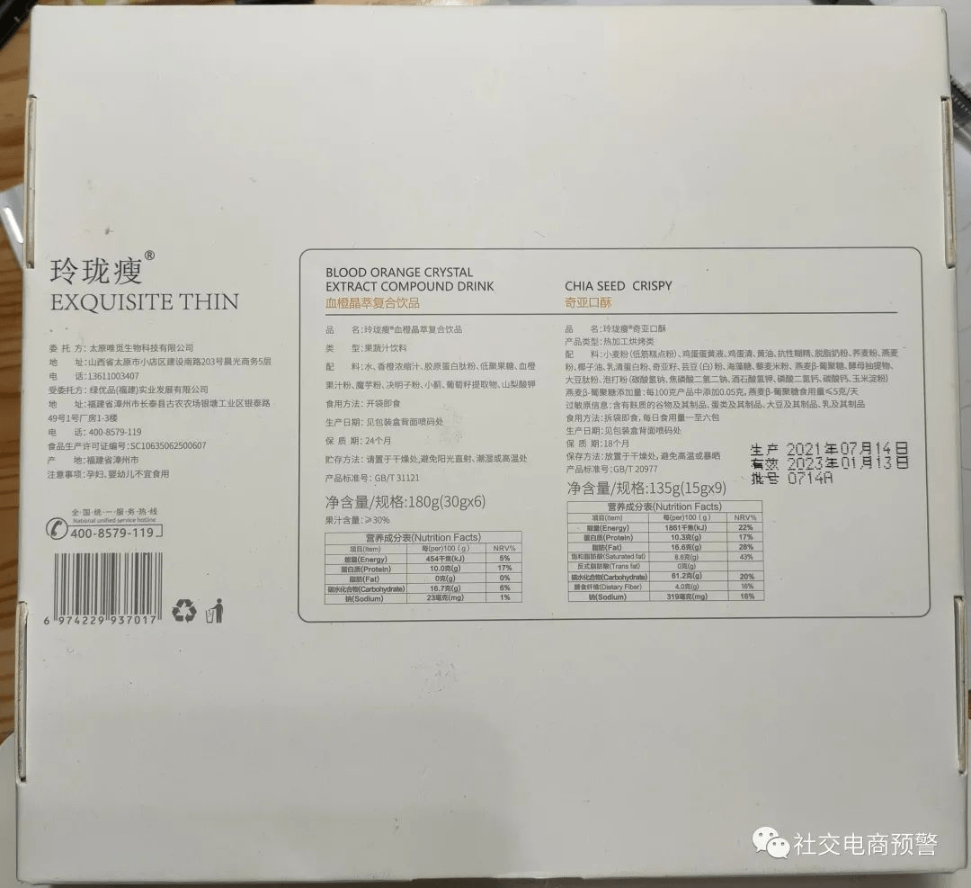 经多方考证,唯觅玲珑瘦饼干血橙饮只是一种普通食品,唯觅公司在没有获得食品销售许可证的情况下大量销售该玲珑瘦系列产品,还把其产品夸大宣传成减肥神器,对于唯觅公司的这种行为,王娟作为受害者向有关部门发起了举报。唯觅公司所在地北京通州食药局,委托方所在地太原小店市场监督管理局已经介入调查。@头条帮忙