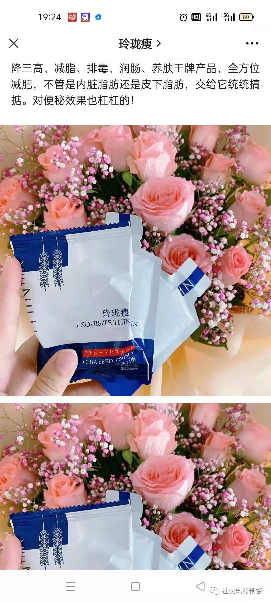 2021年8月,山东淄博的王女士在微商朋友(江苏苏州王某苓)的朋友圈看到唯觅玲珑瘦的饼干血橙饮套餐,王某苓宣称三到五天可以减重五到十斤。