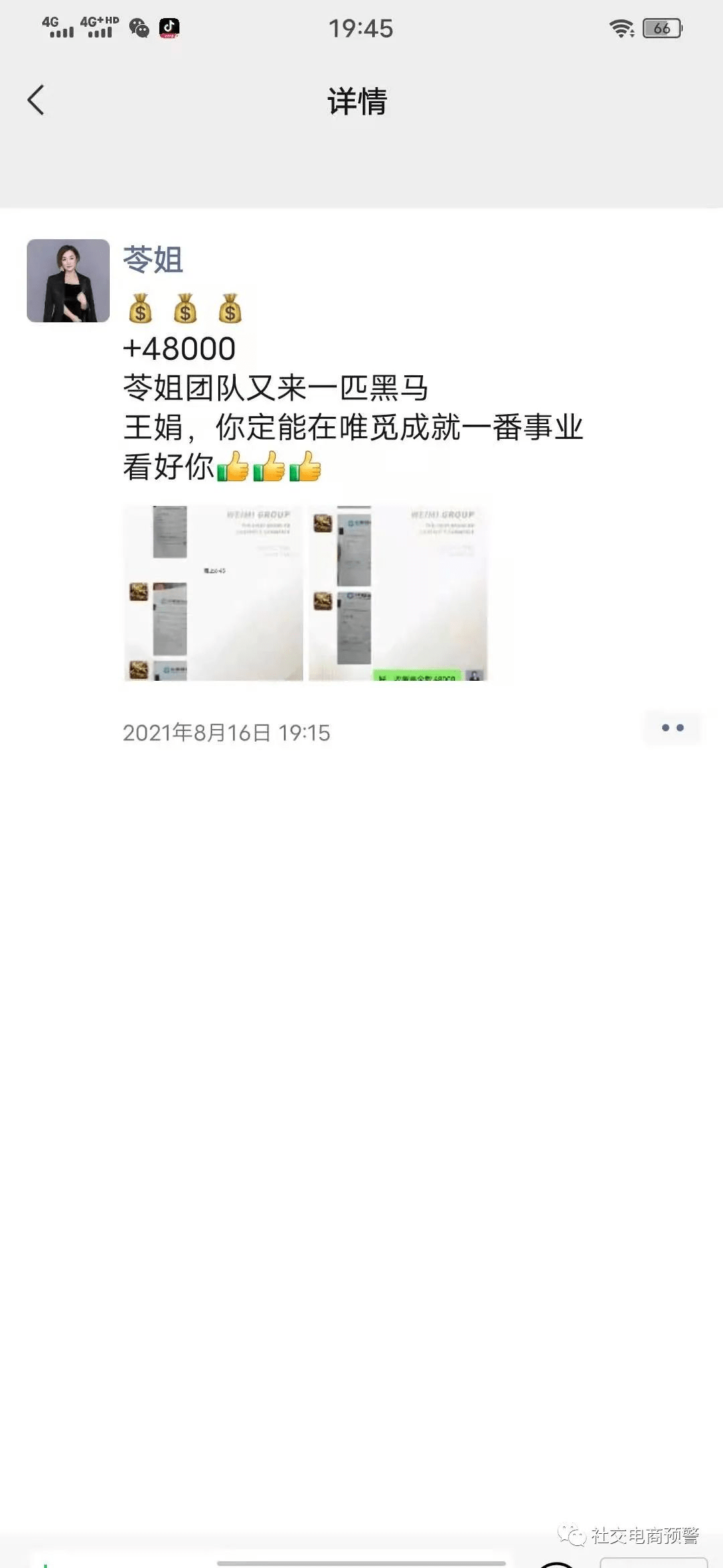 还有他们所谓108将,其实就是利用抖音平台诱骗吸引更多像她一样有着减肥需求的人,同时唯觅公司经销商有素材群,会在微信朋友圈以及培训群内不断发大额收款截图和虚假爆单截图,让下面的代理复制利用,图片真实性无法确定。