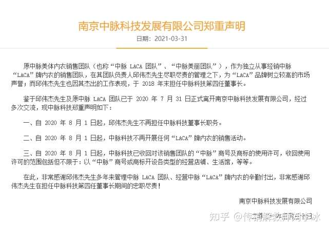 2021年3月,南京中脉科技发展有限公司(以下简称“中脉”)公告称,早在2020年7月31日,原中脉LACA团队正式离开中脉,中脉不再开展任何“LACA内衣 ”的销售活动,同时收回对该销售团队的“中脉”商号及商标的使用许可。