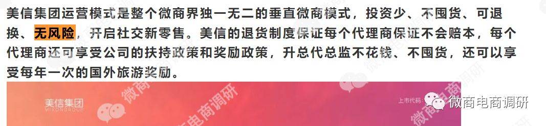 在对外推广美信新零售这个项目的同时,公众号“meixinting”也提到了“无风险”的广告语。