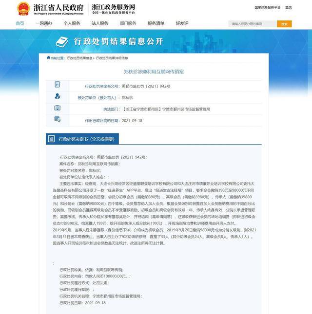 日前,北青网健康频道在浙江政务服务网上看到一则行政处罚信息,显示经道堂某会员因利用互联网传销,被宁波市鄞州区市场监督管理局罚款10万元。