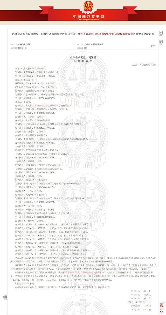 此外,北青网健康频道注意到,该公司在2021年4月,就曾因涉嫌传销被山东省成武县市场监督管理局申请冻结账户。在该案中,其他共同申请冻结账户的关联公司及人员为北京经道堂国际中医药研究院、大连经仁堂科技有限公司、大连扬德贸易有限公司、王洪刚健康管理(大连)有限公司、联服(辽宁)网络科技发展有限公司、大连景圣科技有限公司、大连岐伯贸易有限公司、樟树市灵智信息服务有限公司、王洪刚、王栋、田孝勤、许卓、薛志、李群智、赵允、胡小敏、何会龙名下银行存款,共计9900万元。