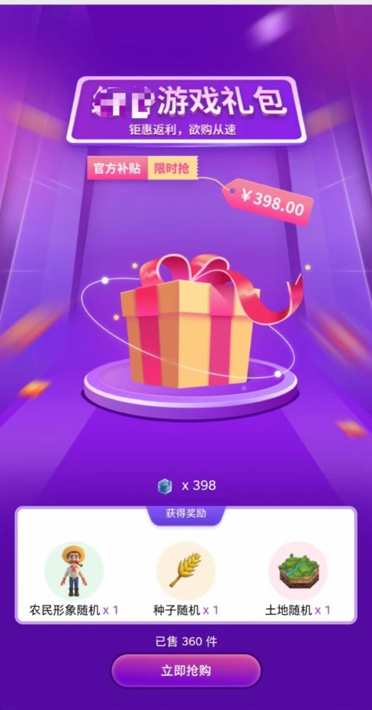 某“元宇宙”农场游戏销售398元的游戏礼包。