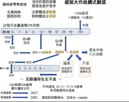 在直通岛商城消费可以获赠等值的金诺丽,类似一种积分可以参与“诺丽大作战”游戏,通过游戏可以有一定的获利,例如1000金诺丽通过30天运转可以变成2000多个,而金诺丽又可以转化成人民币提现。华经见闻asvz.cn发现,直通岛商城的“诺丽大作战”游戏其实就是“消费增值活动”。