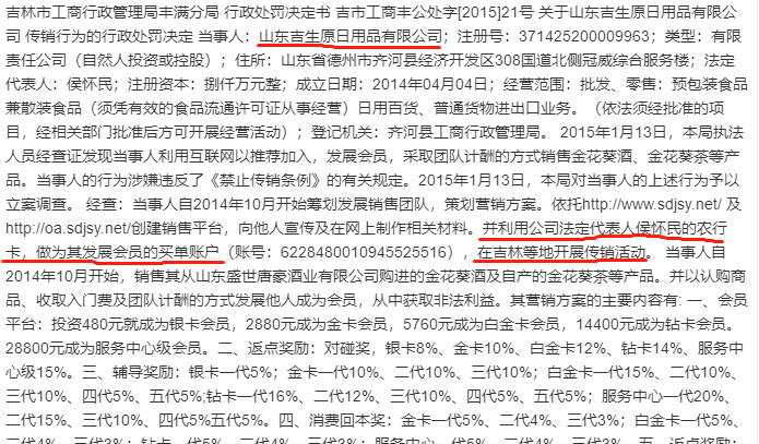 金融鹰眼126jr.com核实,侯怀民还有另外一家公司名为山东吉生原日用品有限公司,这家公司经营的产业也是金花葵酒、金花葵茶等,这家公司则是被吉林市工商部门正式查实传销,侯怀民利用自己的银行卡收取传销资金。