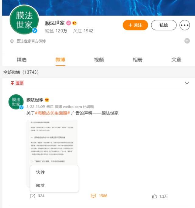 于是乎,膜法世家在2022年3月22日23点通过官方认证的微博致歉,决定撤掉该广告。