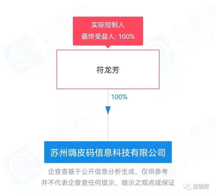 据企查查APP数据显示,苏州嗨皮码信息科技有限公司成立于2015年2月11日,法人符龙芳持股100%,监事王海琴;地址:苏州市吴中区木渎镇丹枫路389号B幢666-1室。