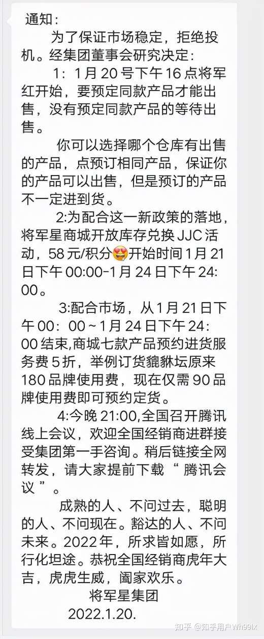 而在春节前夕,这个将军星就发过公告(如上图所示)模式制度有变动,要先进货才能出货,大单子全部停掉不让出,这就是一个很明显的预警信号,聪明的玩家这时候就应该及时撤离,没撤离的都会成为最后的接盘侠。