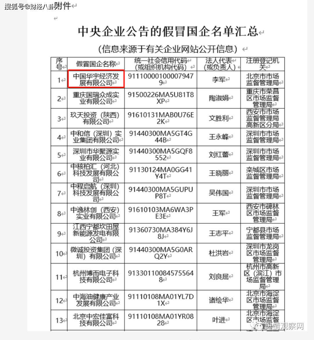 此外,在2021年10月22日,国务院国有资产监督管理委员会发布的“假冒中央企业名单”公告提到,部分央企对外公告了一批假冒国企,与央企无隶属或股权关系,也不存在任何投资、合作、业务等关系。据悉,此次公开的假冒国企名单涉及的企业数量多达353家,其中中国华宇经济发展有限公司不仅赫然在列,更是位列榜单之首!
