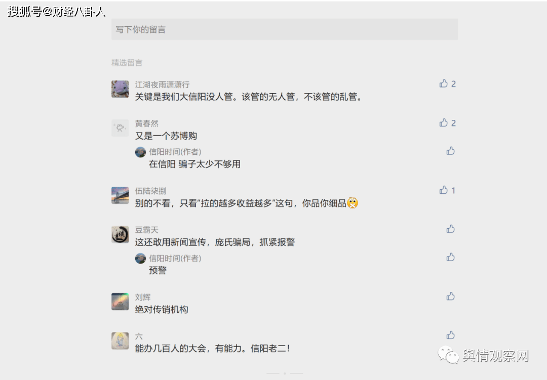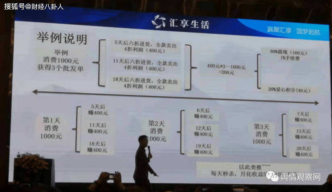 对此,网友发文质疑汇享生活涉嫌传销。据微信公众号“信阳时间”发布信息显示,2月20日在信阳举办了声势浩大的招商动员会,现场也有大几百人。一个人入会交5000元,如果能够拉5个人交5000元入会,那个人就可以获取百分之十到十五收益,拉的越多收益越多。在汇享生活app上买东西,再卖给下线,现在啥买卖可以坐在家里,把钱放人家那里,一个月给你百分之十五收益?是馅饼还是陷阱?