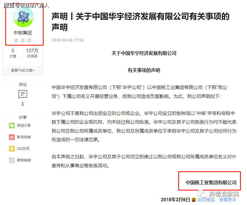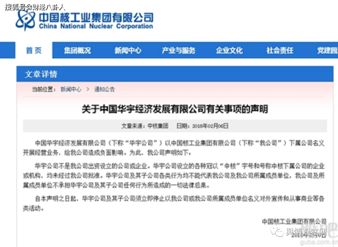 但事实上,中国华宇经济发展有限公司手中的P2P网贷业务出现问题,中核工业集团对此发布声明称,华宇公司非我公司出资设立的公司或企业。华宇公司冠以“中核”字号和号称中核下属公司的企业或机构,均未经过我司批准。