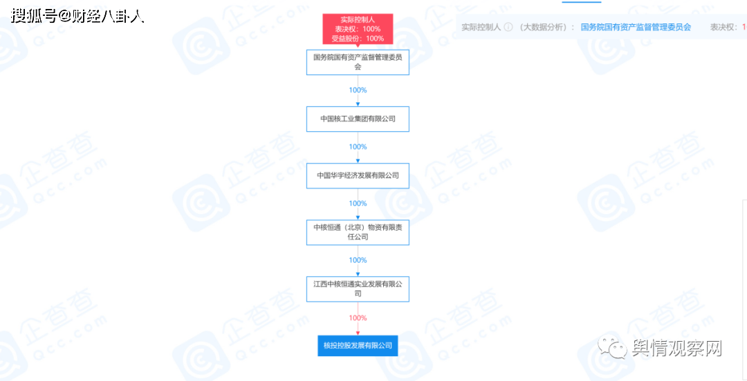 本网通过企查查股权关系发现,江西中核恒通实业发展有限公司由中核恒通(北京)物资有限责任公司控股,中核恒通(北京)物资有限责任公司由中国华宇经济发展有限公司控股,中核恒通(北京)物资有限责任公司再由中国核工业集团有限公司控股,中国核工业集团有限公司再由国务院国有资产监督管理委员会控股。