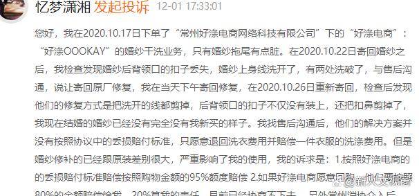 由此可见,好涤优选的模式已经涉嫌传销。不光如此,好涤优选为数不多的线下干洗店“OOOKAY好涤”也受到大量顾客投诉。金融鹰眼126jr.com在某平台发现,用户投诉称“在2020.10.17日下单了“常州好涤电商网络科技有限公司”下的“好涤电商”:“好涤OOOKAY”的婚纱干洗业务,只有婚纱拖尾有点脏。在2020.10.22日寄回婚纱之后,我检查发现婚纱后背领口的扣子丢失,婚纱上身线洗开了,有两处洗破了。