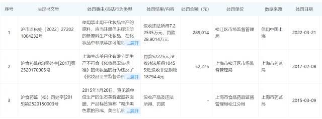 2017年2月8日,上海生态美日化有限公司生产不符合《化妆品卫生标准》的化妆品的行为违反了《化妆品卫生监督条例》第二十七条的规定,被上海市松江区市场监督管理局罚款52275元,没收违法所得10455元,没收非法财物18794.4元。