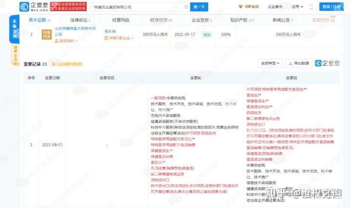 特康宣传的各种产品的生产企业是特康集团旗下的特康药业集团有限公司,该公司成立于2018年04月24日,企业地址位于山东省日照市经济开发区,法定代表人为周永艳,总经理孙隆达,注册资本为12000万元人民币,实缴资本1000万元人民币,所属行业为医药制造业。值得关注的是,特康集团除了上诉种种不合格以及违规行为被罚外,特康宣传的各种产品的生产企业在2021年8月3日变更许可项目后,特殊医学用途配方食品生产和特殊医学用途配方食品销售这两项都没有经营范围了,那么现在特康售卖的各种自称是“特医食品”的固体营养粉,显而易见只是普通的固体饮料。