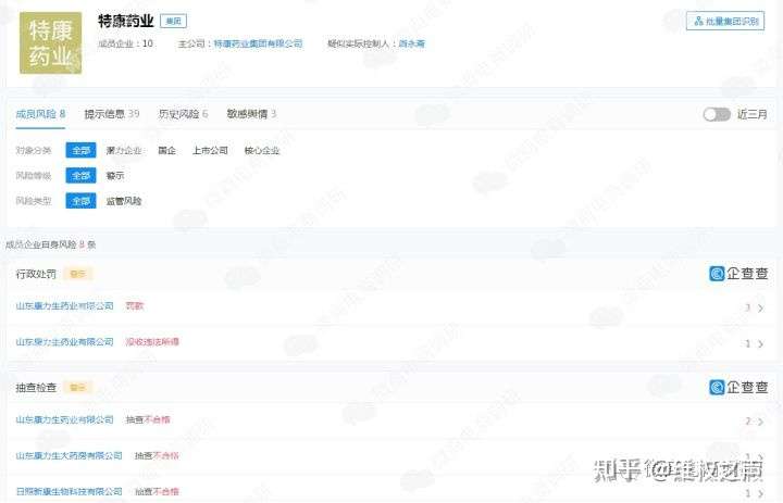 特康药业集团旗下的山东康力生大药房有限公司曾在2019年09月29日、2020年02月05日被日照市市场监督管理局抽查结果都为不合格,特康药业集团旗下的日照新康生物科技有限公司在2019年03月06日被莒县公安局抽查不合格。